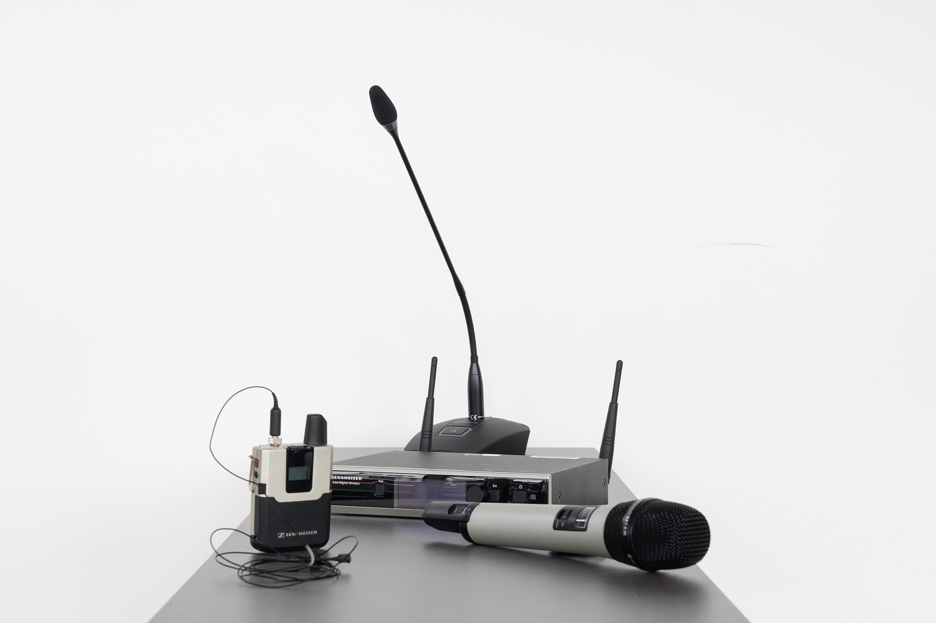 In den meisten hybriden Hörsälen gibt es Headsets sowie Ansteckmikrofone mit dazugehörigen Taschensendern. Vereinzelt gibt es zusätzlich ein Handmikrofon und/oder ein Tischmikrofon.